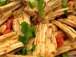 腐竹是我國傳統(tǒng)的大豆制品,它是將豆?jié){經(jīng)過加熱煮沸后,挑出表面形成的一層薄膜,再經(jīng)干燥或者烘干而成,可以說是豆?jié){中精華部分集合而成。有的地方腐竹又叫腐皮、豆腐棍、豆棍、豆筋等,人稱大豆中的“黃金”。